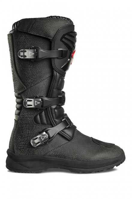 Fully waterproof and made of high-quality black full-grain leather, treated with oil for improved resistance, these have a solid, textured look, combined with a load of safety features - anatomic, anti-shock internal padding, ankle bone protection on both sides, branded shin guard in PU and gear shift pad. The special sole in 100% rubber is specifically designed with a customised pattern, that is both non-slip and self-cleaning, thanks to the special tread with staggered lug pattern that stops dirt and mud from sticking, to give maximum grip on any surface.