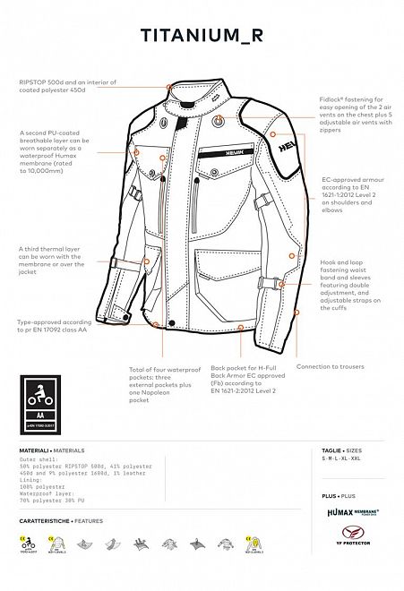 The TITANIUM is a ¾ length, three layer technical jacket, for those motorcyclists who never stop riding even during the colder months. Versatile enough to cope with heat, cold and rain, this jacket is fully functional in any weather thanks to its three separate layer construction. The outer shell is made of 600D RIPSTOP and 600D Polycordura, coated on the inside to offer an optimal level of waterproofness. The second removable layer is a waterproof and breathable membrane, while the third layer is a thermo liner and also removable.