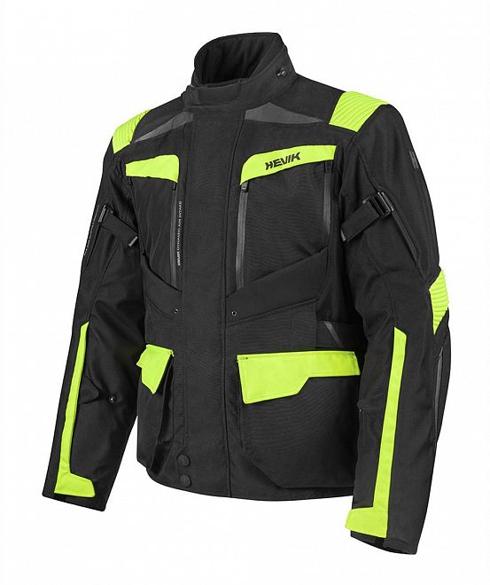 2 adjustable air vents on the forearms, adjustable at the waist and wrists thanks to the adaptable hook and loop fastenings and with four waterproof pockets plus one “Napoleon” pocket, a rear pocket for an approved back guard, double adjustment on the sleeves, with a dynamic adjustment system and the option for attachment to the trousers with a zip.