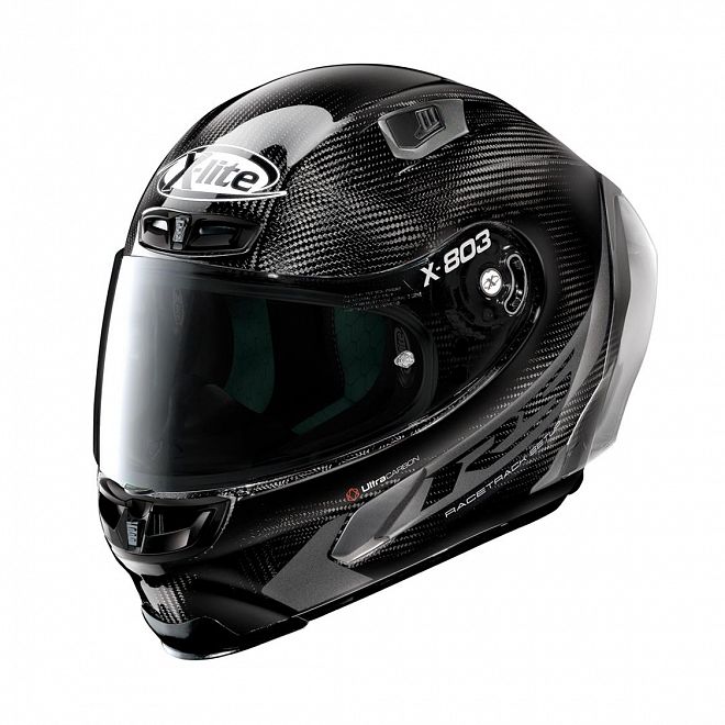 The X803RS Ultra Carbon is packed with features and enhanced by an exclusive racetrack setup. It comes with an additional clear visor, a Racetrack Aerodynamic Spoiler (removable), and an exclusive adjustment system for the position of the liner. Also includes all the same high quality features of the original X803 Ultra Carbon, such as the Nolan Emergency Release System to allow emergency teams to remove the helmet with minimal risk of further injury, Racing Air Flow ventilation system to keep you cool, and an Adjustable Stability Device so you can optimize air-flow for your own body size and riding style, as well as the usual premium features like a double action, Pinlock® visor, Single Block cheek pads, washable carbon inner liner and a revised chin shape to improve comfort.