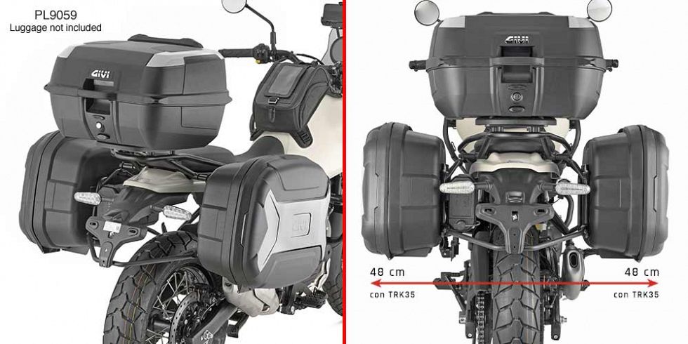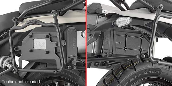 To fit panniers, you will need a Givi PL rack. You can use the PL9059 for Givi hard Monokey panniers. The S250 toolbox can be mounted on the pannier rack using the TL9059KIT fitting kit (S250 toolbox sold separately).