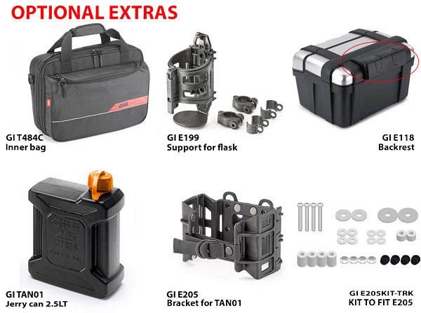 The TRK33, TRK46 and new TRK35 can all be used as either panniers or as a top box, while the TRK52 is one of the largest top boxes in the Givi range, making the standard Trekker range of hard luggage the most versatile in the Givi line-up. When bought as a pair, the TRK33 is keyed the same, and includes an extra lockset if you want to match your existing topcase. Available in anodised aluminium or painted black finish.