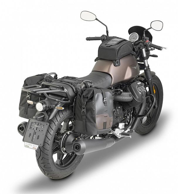 The Corium range of soft luggage from Givi is designed with classic and custom bikes in mind Apart from the elegant styling, the beauty of the Corium range is that it is designed to be hardware free. A cleverly designed strap system allows you to fit a single, or pair of panniers, adjusted for height and position, without the need for any steel framework. The roll-top, waterproof panniers are available in two different sizes, with a range of other bags designed to complement the entire look. Now you don’t have to compromise on style to get high quality, practical soft luggage.