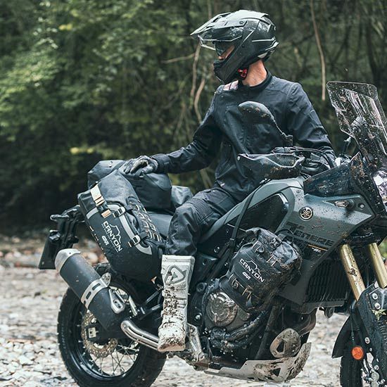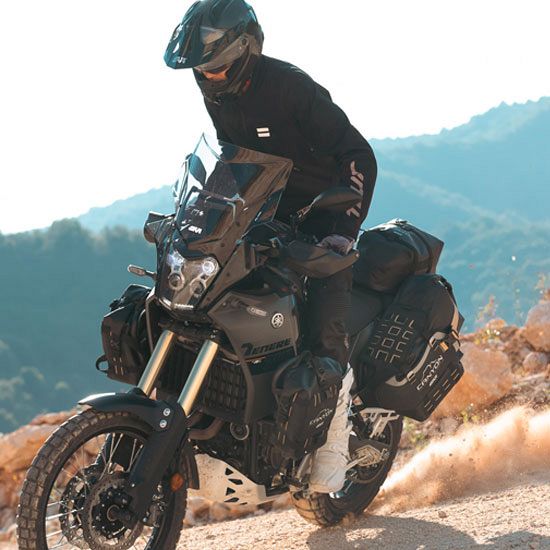 Made from high-strength materials, it's built to handle rough tracks and wild weather. The set includes two 16 litre side bags and a 12 litre top bag, all fully waterproof with roll tops and welded seams. M.O.L.L.E. panels let you attach extras like tool rolls or the mini GRT730 bag, and reflective detailing improves visibility in low light.