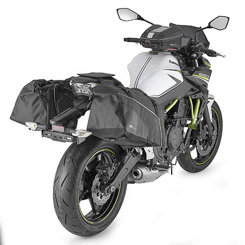 Pair of waterproof side bags, 25 litre each side. Equipped with straps to be placed under the saddle, to allow the hooking of the bags through a double ring system.