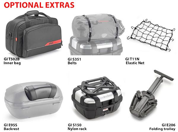Using Givi's patented Monokey system, the case can easily be attached or removed from your motorcyle (fitting hardware sold separately). Optional accessories include the E95S backrest, the T502B inner bag, the S150 universal rack, the T11N elasticated net and the E206 folding trolley.