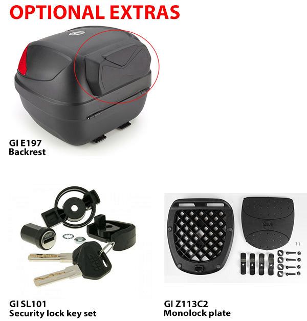 Disclaimer:  Givi's Monolock top cases are designed primarily for scooters or small capacity motorcycles whose use is typically urban commuting at speeds not exceeding 60kph.  Their lightweight construction is not intended for use on large capacity motorcycles at highway speeds, for these applications we recommend Givi's Monokey top and side cases.