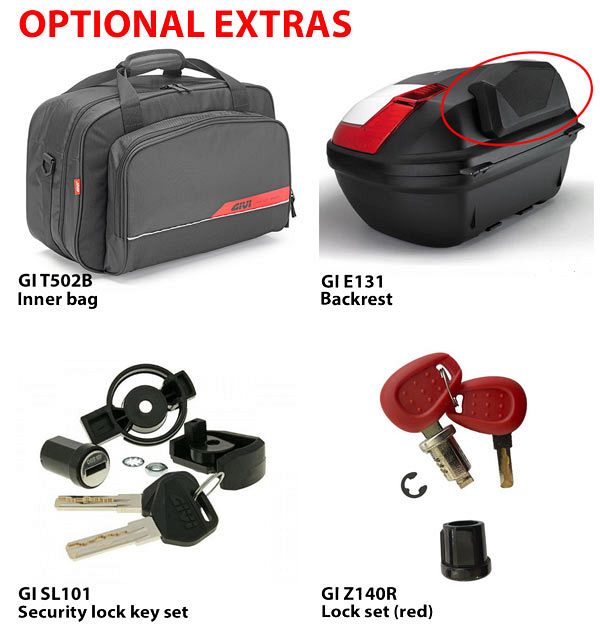 E455N SIMPLY IV is a 45 litre Monolock top-case with red reflectors. Universal kit and plate are included. Maximum loading of up to 3kg.