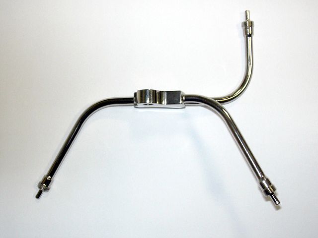 3-way junction that bolts straight up to the underside of the bottom fork yoke.  Our stainless steel braided hoses screw directly to it.  Suitable for most late model twin disc Harleys.