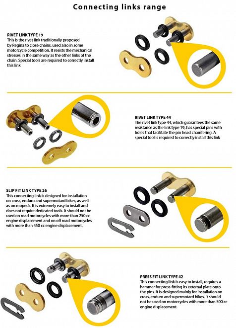 Due to close clearances between the frame and gearbox on many older bikes, modern motorcycle chains cannot be used. Regina Classic chain is built to the same physical dimensions as the chain fitted as original equipment on most older bikes. Available in the original style natural colour, the strength and integrity of this range is a continuation of Regina’s dedication to quality and durability. Half links are available in some cases, in line with original chain fitment requirements.