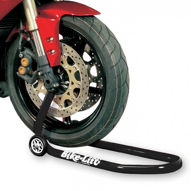 Universal front stand to fit into the underside of your motorcycle front fork. Made in Italy.