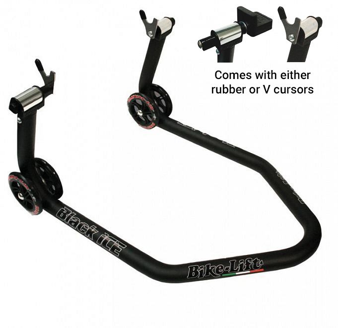The Black Ice range from Bike Lift is made from high quality 40 mm special steel for more rigidity and stability, but with a lower weight. They feature easily adjustable cursors, either V style for bikes with stand bobbins, or rubber blocks for under the swingarm. They also have super light 120mm nylon wheels and come in a stunning satin matt black finish.