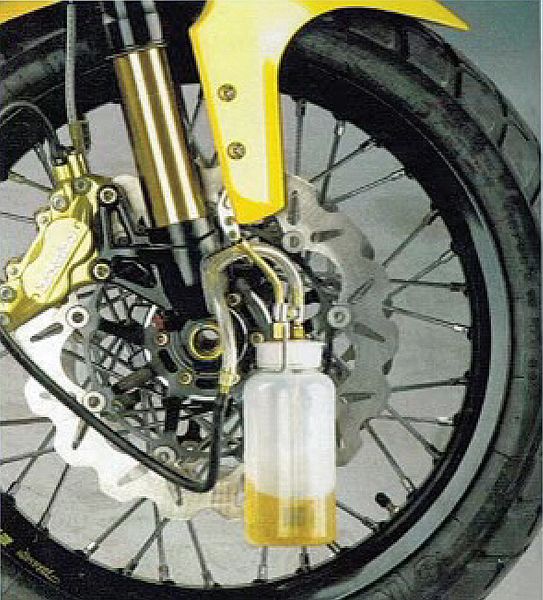 The collection reservior eliminates annoying spills when changing the hydraulic fluid by using the brake or clutch lever to pump it out.  It incorporates a check valve to prevent air from entering the system.  This handy unit can be attached directly to the bike and has a built-in filter.