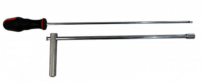 This handy tool features a 280 mm long driver with an 8 mm hex socket and flat blade screwdriver. It allows the lock nut to be undone and re-tightened with the screwdriver in place.