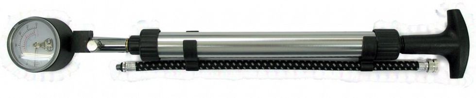 Fork air pump with gauge. Fits Schrader valves (also called American valve).