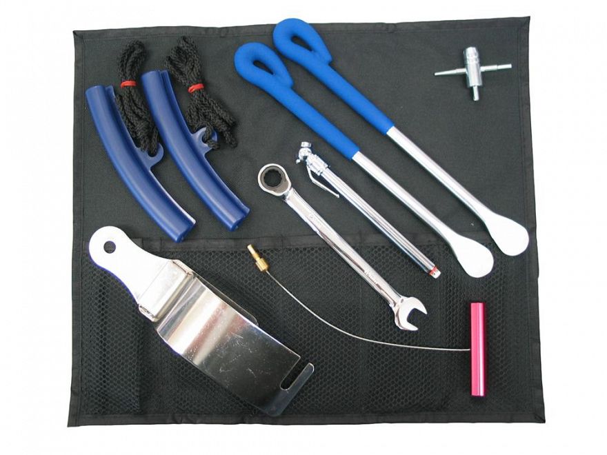 Tyre change kit complete in a tool roll. Two tyre levers, valve tool, rim protectors, ratcheting spanner, pressure gauge, bead tool, valve stem puller.