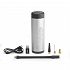 Battery-operated air compressor, rechargeable via USB port, also usable as an emergency torch.