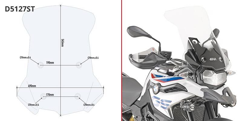 D5127ST - Specific screen, transparent 54,5 x 49 cm (H x W). To be mounted instead of the original screen / 27 cm higher than the original. Specific kit D5129KIT also needed for F750 GS and F800 GS.