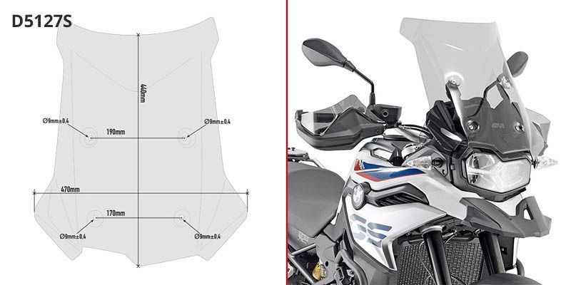 D5127S - Specific screen, smoked 44 x 47 cm (H x W). To be mounted instead of the original screen / 17 cm higher than the original. Specific kit D5129KIT also needed for F750 GS and F800 GS.