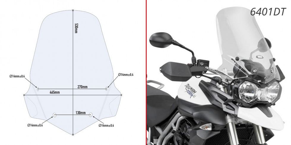 6401DT - Specific screen, transparent 53 x 46,5 cm (H x W) not compatible on version with a height adjustable windshield / to be combined with the specific D6401KIT fitting kit / 17 cm higher than the original